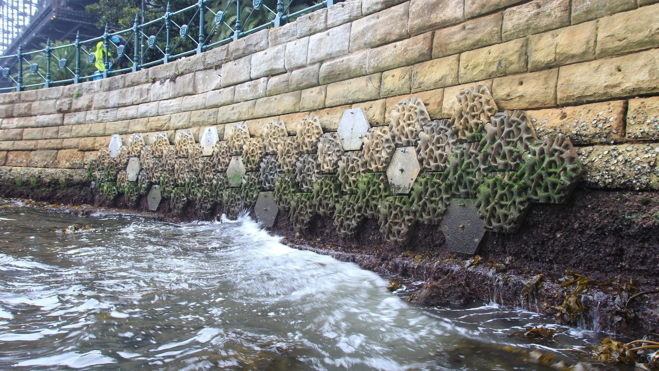 The new panels have been designed to mimic the rocky reefs and seaweed forests around Sydney Harbour. We incorporated oyster shells and crushed sandstone to provide additional habitat opportunities for marine life, including fish, seaweed, oysters and other molluscs, lace corals, sea squirts and sponges. The scientific team is also testing the effectiveness of transplanting seaweeds to the surface of the substrates.